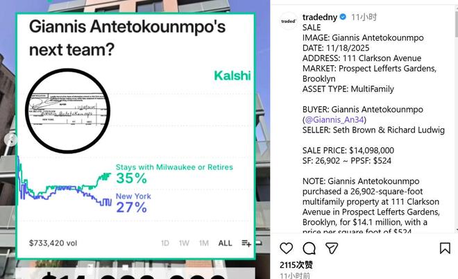 根据美媒Traded报道,字母哥上个月已经在纽约市布鲁克林区的克拉克森大道购入一栋包含28套房的公寓大楼,总面积约2500平方米,价值1410万美元。