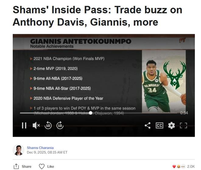 在此之前,ESPN名记Shams才撰写长文更新字母哥与雄鹿队目前的状况,指出字母哥与其经纪人亚历克斯-萨拉西斯已就字母哥未来与雄鹿队展开讨论。