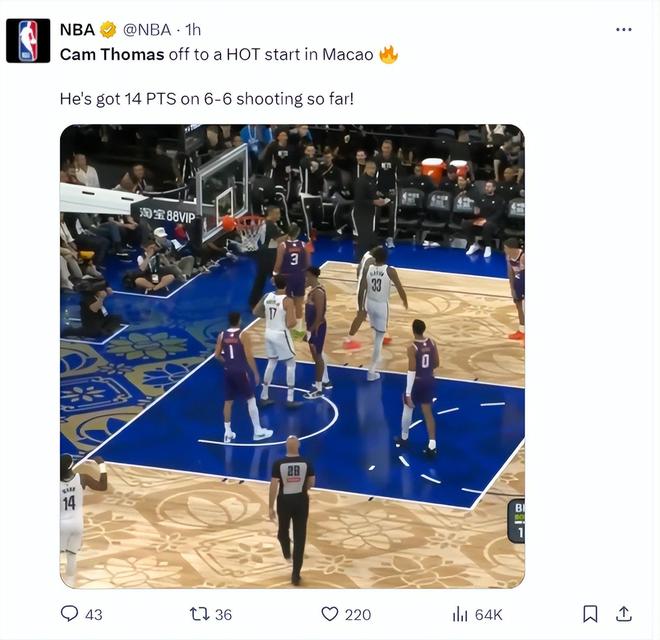 北京时间10月10日,NBA中国赛,篮网VS太阳,这场比赛是中国球员曾凡博的篮网首秀,但主角却是卡姆-托马斯,小火车这场比赛开场一波6中6连拿14分引来惊呼连连,三节打卡22分6助攻3篮板十分出彩。